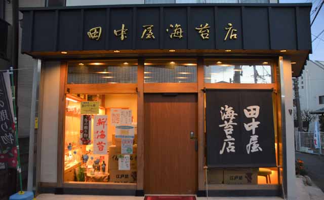 ご先祖の田中徳次郎さんは、浦安に海苔の養殖を広めた方で、当時漁業組合長や村長・町長も務め、地域のみんなで海苔の養殖を開始。また日本橋の山本海苔店で修業し、みんなが作った海苔を日本橋に売りに行っていたことから仲買を始めたそう。戦後に小売りを始め、今は木更津や富津の海苔を入札場で買い付けてきています。ただつやつやしているものでなく、ざらざらとした手触りのものがいいなど、海苔の品質をみる目利きは代々受け継がれています。