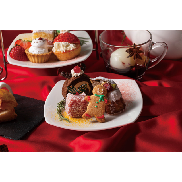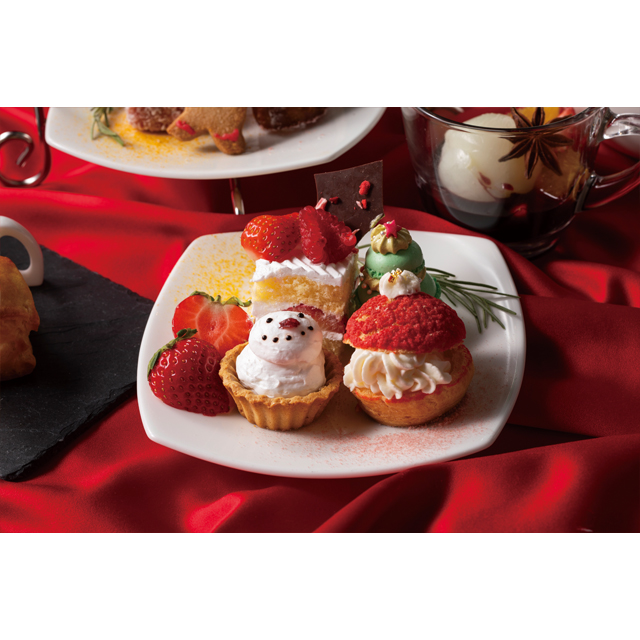 いちごのショートケーキ/サンタシュークリーム/バナナタルト・ショコラブラン/ピスタチオマカロンツリー/トナカイのカフェモカロールケーキ/ライチ&ラズベリーのラミントン/ジンジャーブレッドクッキー/マンディアンショコラカヌレ/シュトーレン/スコーン 焼きりんごジャム・ホイップクリーム添え/スパークリング・フルーツジュレ/赤ワイン アフォガード