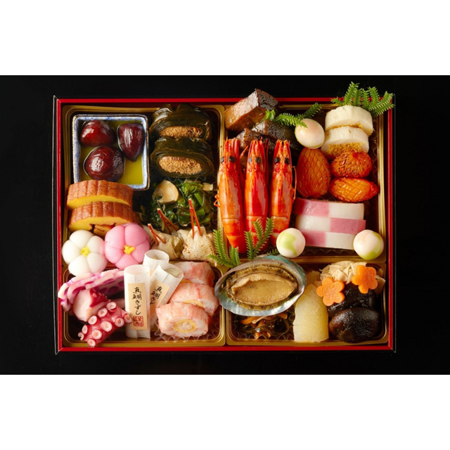 渋皮栗甘露煮ときんとん、子持鮎昆布巻、伊達巻、花餅白梅、花餅紅梅、アカニシ貝と菜の花の昆布和え、炙りのどぐろ松葉、ブリ照焼、海老の旨煮、身巻カラスミ、いか松笠雲丹焼、紅白彩り蒲鉾、彩手毬、梅花れんこん、わさび酢だこ、真鯛きずし金箔紙包み、紅白なます柚子風味、かに水車巻、松前漬、鮑割烹煮、数の子、湯葉の有馬煮、どんこ椎茸柚子煮、洋人参梅型