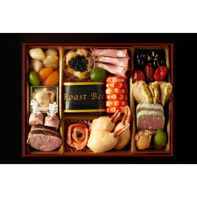 帆立貝柱まったり和え、杏子さわやか煮、海鮮ミックスマリネ、合鴨ワイン煮、若桃甘露、ベーコンチーズドック、ぷちぷり海老サラダ、黒糖ローストポーク、ローストビーフ、日の出海老、雪掛けローズサーモン、カニ爪冷製オーロラ、北海道黒豆、くるみのキャラメリゼ、ドライトマト赤ワイン煮、鶏チーズ焼き、ビーフテリーヌ、直火焼帆立