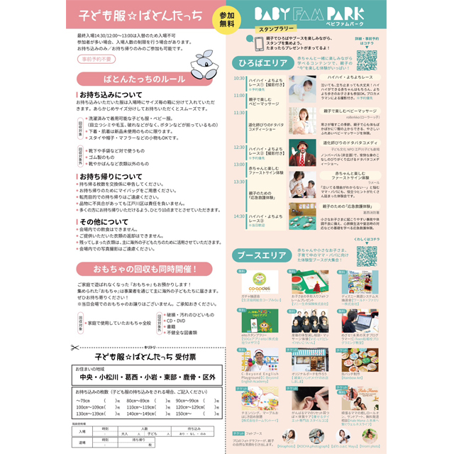 江戸川の大人気子育てイベント! 「子ども服☆ばとんたっち」「BABY FAM PARK(ベビファムパーク)」 パパママに大人気のイベント「子ども服☆ばとんたっち」「BABY FAM PARK(ベビファムパーク)」が、昨年に引き続き11月23日(日)にタワーホール船堀で同時開催されます。家にしまってある子供のサイズアウトした服の回収とともに、好きな服と交換できる「子ども服☆ばとんたっち」、我が子の姿をカメラに収めていい思い出に! ハイハイ・よちよちレースやフォトブースなど子育て世代に嬉しいブースが目白押しの「BABY FAM PARK」。楽しく参加しながら地域のママ友と気軽に会話できる機会にもなります。イベントには事前予約が必要なものもあるので、早めにホームページをチェックしてみて。 ■日時:11月23日(日)11:00~15:00 参加無料 ■場所:タワーホール船堀(江戸川区船堀4-1-1) ■開催内容: ●子ども服☆ばとんたっち 不要な子供服の回収、子供服の交換会、おもちゃの回収※ ・最終入場14:30 ・12:00~13:00は入れ替えのため入場不可 ※集まったおもちゃは事業者を通じて海外の子供に届きます ●BABY FAM PARK(ベビファムパーク) 《ひろばエリア》 ハイハイ・よちよちレース 大道芸クラウンのパフォーマンス 親子で学べるプログラム ・ベビーマッサージ ・ファーストサイン ・応急救護体験(葛西消防署) ※事前予約が必要なものあり。 《ブースエリア》 ワークショップ(手形・足形スタンプ、缶バッジづくりなど) 体験(耳つぼ、整体など) フォトブース 【主催】 子ども服☆ばとんたっち:江戸川区環境部清掃課資源循環推進係 BABY FAM PARK(ベビファムパーク):まいぷれ江戸川区 【協力】 子ども服☆ばとんたっち:株式会社オーティエス、まいぷれ江戸川区 【後援】 BABY FAM PARK(ベビファムパーク):江戸川区
