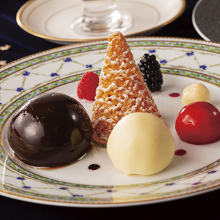 ・三色のムースを球体に仕上げて アイスクリームと三色のフルーツと共に