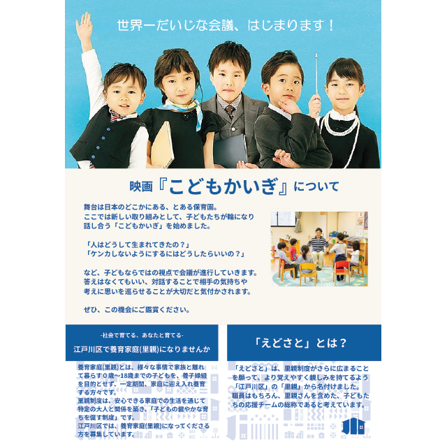 映画「こどもかいぎ」上映会が3月19日(木)にタワーホール船堀で開催 江戸川区で里親のサポートをしている江戸川区児童相談所フォスタリング機関「えどさと」が、3月19日(木)に映画「こどもかいぎ」をタワーホール船堀で上映するイベントを開催します。先着申し込み60名なので、お早めに申し込みを。 《映画「こどもかいぎ」について》 舞台は日本のどこかにある、とある保育園。 ここでは新しい取り組みとして、子どもたちが輪になり話し合う「こどもかいぎ」を始めました。「人はどうして生まれてきたの?」「ケンカしないようにするにはどうしたらいいの?」など、子どもならではの視点で会議が進行していきます。答えはなくてもいい、対話することで相手の気持ちや考えに思いを巡らせることが大切だと気付かされる映画です。 《えどさととは》 江戸川区の里親制度を支えるチームの総称で、「江戸川区の里親」から名付けられました。里親制度を必要とする子どもと里親さんを繋ぎ、サポートする活動を行っており、江戸川区児童相談所やフォスタリング機関、そして現役の里親さんたちで構成され、里親制度に関心のある人への情報提供や説明会開催、交流イベントなどを通じて、子どもたちが家庭で安心して暮らせる環境づくりを推進しています。 《イベント情報》 【開催日】3月19日(木) 【時間】18:30~20:15(開場18:15~) 【場所】タワーホール船堀 研修室 【参加費】無料 【定員】先着60名 【申し込み】 こちらから申し込みが必要です https://forms.gle/bPcvBRWq8DG1dBq57 【お問合せ】 江戸川区児童相談所 フォスタリング機関 TEL 03-5678-1810(平日8:30~17:00)