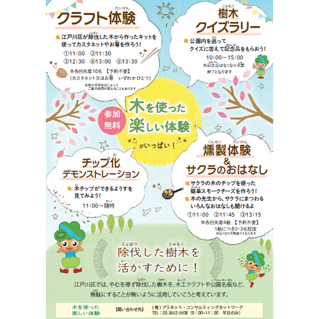 3月7日(日)にさくらパークカフェが開催! 木のクラフトやクイズラリーも 江戸川区が力を入れている、地域ではぐくむ「みんなのこうえんプロジェクト」のイベント「さくらパークカフェ」が3月7日(土)に東葛西さくら公園で開催されます。普段は公園の清掃活動をしてくれていますが、今回は木のクラフト体験や燻製体験、樹木クイズラリー、ステージ企画など親子で楽しめるプログラムが満載。キッチンカーも来るので、おいしいグルメでお腹も満たしながら、公園で過ごしてみては。 ▼「みんなのこうえんプロジェクト」これまでの活動の様子はこちら https://youtu.be/pE8Eel9eKeg 《イベント詳細》 ■日時:3月7日(土)10:00~15:00(キッチンカーは11:00スタート) ■場所:東葛西さくら公園(江戸川区東葛西4-10-1) ■開催内容: おにぎり、バインミー、ベビーカステラ、りんご飴、コーヒー等の販売 大人も子どもも楽しめるアクティビティ、ステージ企画(歌やフラダンス)、宝石探し、謎解き大会、かるた取り、クリーンアップクラフト体験、燻製体験、樹木クイズラリーほか 【企画・出店】 ひなぼこ楽団、えどBAY地域共創ミライ、Mano a Mano、あたしんち、元氣玉、HiwaHiwa、江戸川結社かるた部、ASOBO会、ちゅら~マーリエ、江戸川区 【木を使った楽しい体験】 プラネット・コンサルティングネットワーク 【問い合わせ先】 パークカフェ事務局 ひなぼこ楽団 みっちゃん TEL:080-5436-7210 Mail:hinaboco@gmail.com