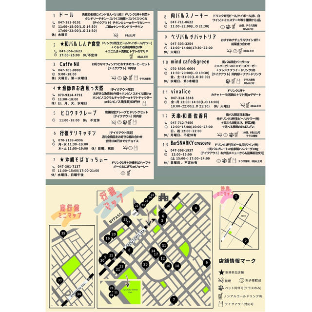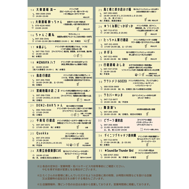 ■ドール ■和バルしんや食堂 ■Caffe Nil ■漁師のお店魚っ天然 ■ヒロウチクレープ ■行徳デリキッチン ■沖縄そばひっちぃー ■肉バルスノーキー ■ベジバルチバットリア ■MIND cafe&green ■vivalice ■天串×和酒 佐香月 ■BarSNARKY crescere ■大衆酒場 浜一 ■大衆酒場 酔っちゃん ■ちゃんこ鷹丸 ■串よし ■IZAKAYAハナ ■鳥造 行徳店 ■宮崎地鶏の店こま ■DEN2×BARちゃん ■千寿司行徳店 ■Quokka ■大衆立呑倶楽部CUE ■鳥と肴と炭委の店おけ福 ■つくね家にっかぽっか ■たっちゃん家行徳店 ■のぼる ■行徳酒場 おしお ■サケトメシGOZZO ■サカバー★いま ■舞浪漫’s ■ピザーラ 浦安店 ■ダイニングキッチン奈央輝 ■Sound Bar Thunder Bird